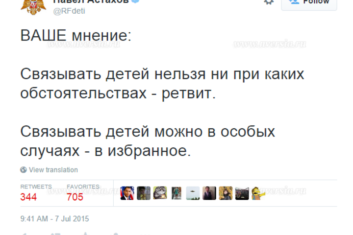 Тем, кто считает связывание детей недопустимым, предлагается сделать ретвит. Добавить твит в избранное могут те, кто считает связывание возможным в особых случаях. По данным на 14.40, 712 человек выступили в качестве сторонников связывания, 349 пользователей — противники такой меры.