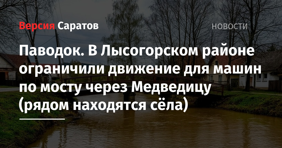 Из-за повышения уровня воды Лысогорском районе ограничено автомобильное движение по мостам через реку Медведица у сёл Атаевка и Невежкино. Об этом сообщил губернатор Саратовской области Роман Бусаргин.