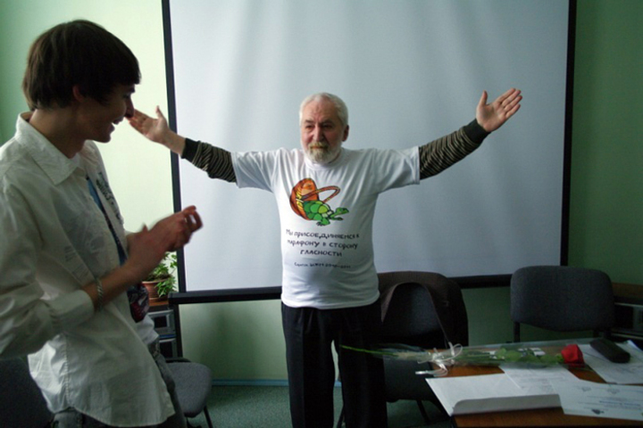 Фонд защиты гласности ставит перед собой менее глобальные цели. Одним из первых лозунгов фонда было: «Гласность — это возможность выкрикнуть из толпы, что король голый. А свобода слова — это возможность сказать об этом королю до выхода на площадь». «Но через некоторое время мы увидели, что большинство этих мальчиков кричат «король голый» не потому, что это действительно так — у них заказ от соседней династии, - рассказал Симонов. - После этого у фонда появился новый лозунг: «Гласность — черепаха, которая ползет по пути к свободе слова». А вместе с ним и моя коллекция черепах, которая на сегодняшний день насчитывает более 3 тысяч экспонатов». Узнав об этом, учащиеся школы преподнесли Алексею Кирилловичу подарок — майку с изображением очередной черепахи и надписью «Мы присоединяемся к марафону в сторону гласности».