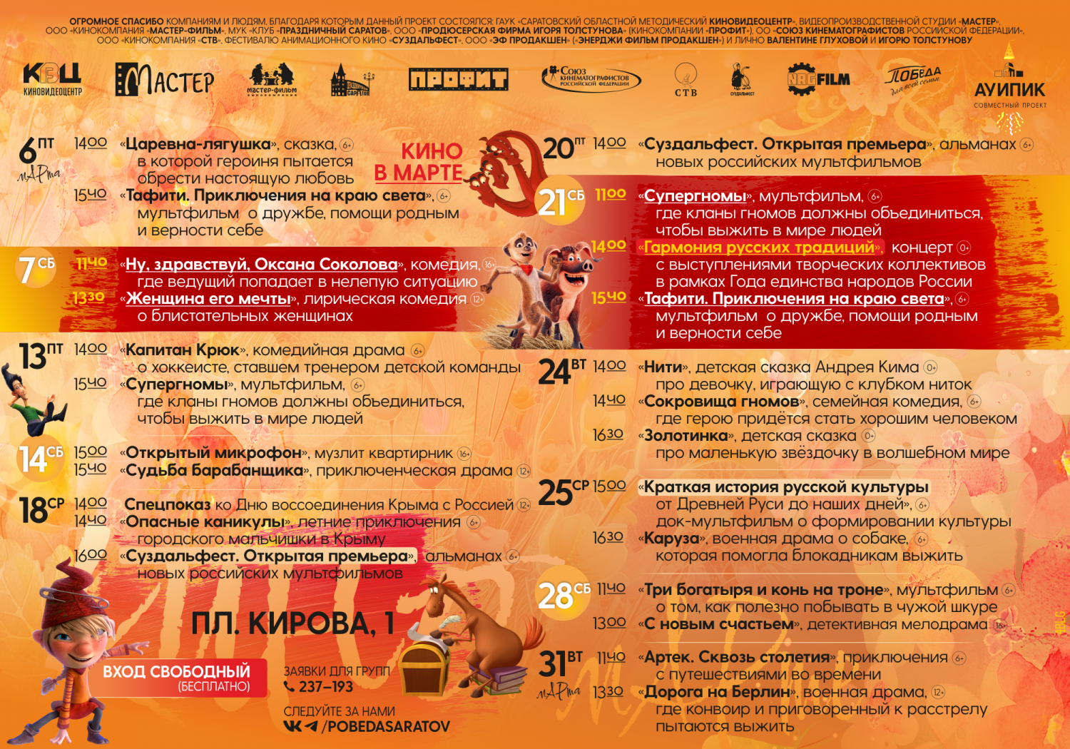 В марте в саратовском кинотеатре «Победа», который принадлежит государству, продолжатся бесплатные кинопоказы. Средне-волжский филиал ФГБУК АУИПИК, в оперативном управлении которого находится памятник, поделился с ИА «Версия-Саратов» афишей.