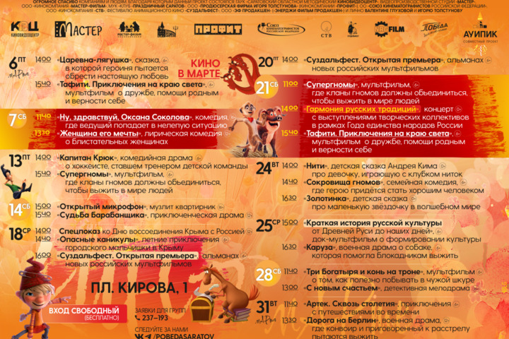Показы будут идти 6, 7, 13, 14, 18, 20, 21, 24, 25, 28 и 31 марта. В программе представлены сказки, мультфильмы, комедии, драмы.