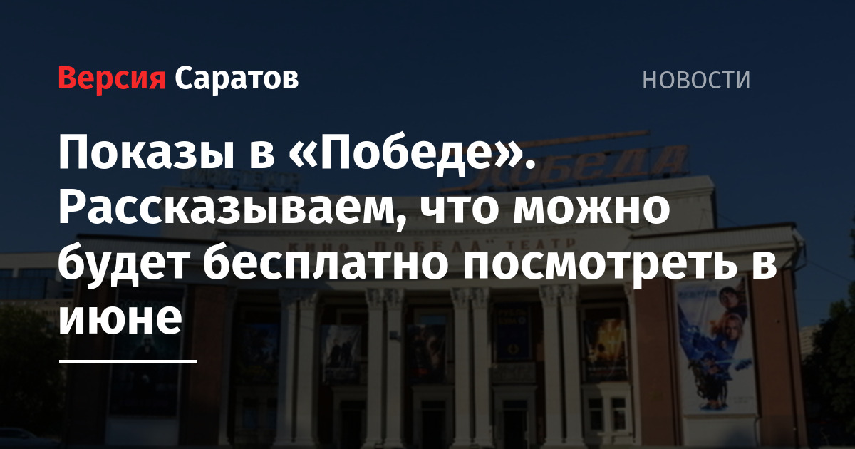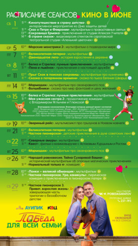 В саратовском кинотеатре «Победа» в июне продолжатся бесплатные показы фильмов и мультфильмов. Расписание сеансов «Победа» предоставила ИА «Версия-Саратов».