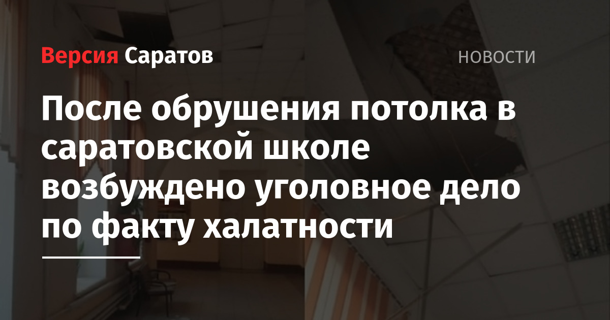 В Саратове после обрушения потолочной конструкции в школе № 67 Кировского района возбуждено уголовное дело по факту халатности (ч. 1 ст. 293 УК РФ). Об этом рассказали в СУ СК по региону.