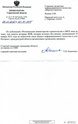 Прокуратура Саратовской области проверит информацию об отсутствии жилья у ветерана Великой Отечественной войны Нины Запольских. Как сообщается в уведомлении ведомства, присланном ИА "Версия-Саратов", прокуратура проведет проверку по фактам, изложенным в публикации "Региональное министерство строительства и ЖКХ пока не знает, чем помочь ветерану ВОВ, которая осталась без жилья".