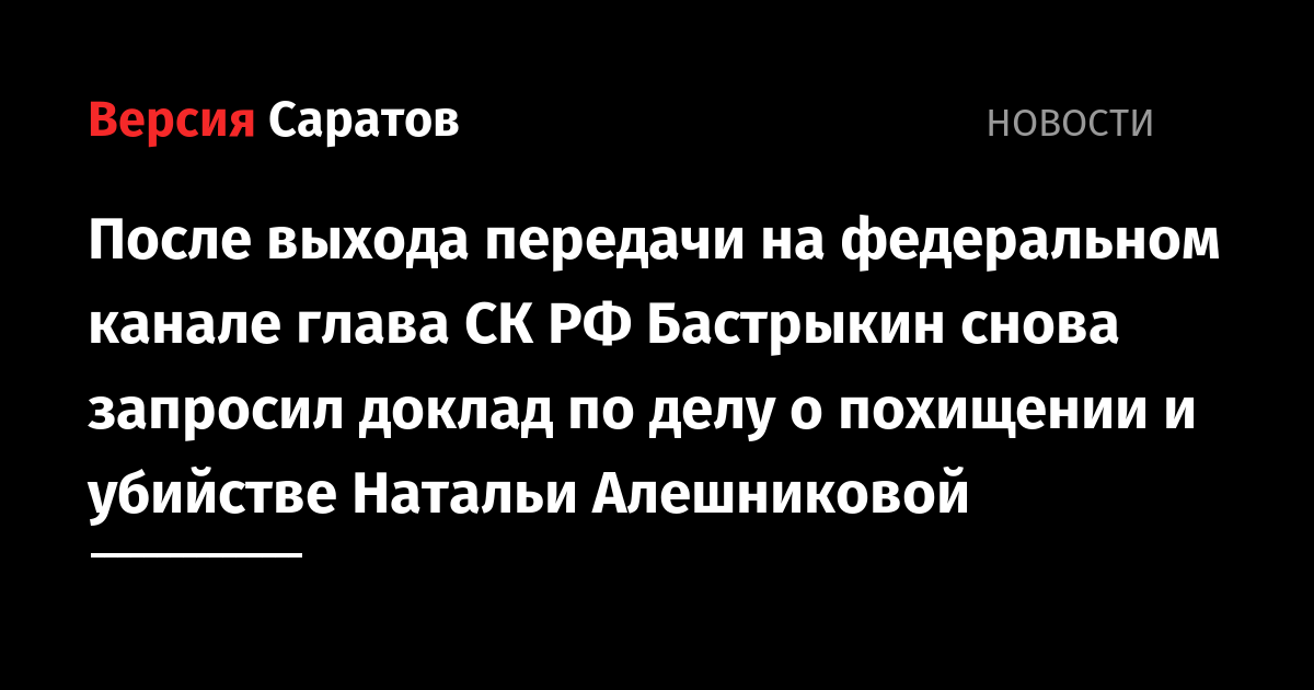 На телеканале «Россия1» показали выпуск программы «Малахов», посвященный убийству бизнесвумен из Балаково Натальи Алешниковой. После этого глава СК РФ Александр Бастрыкин запросил повторный доклад по обстоятельствам расследования уголовного дела о ее похищении и убийстве. Об этом рассказали в пресс-службе федерального ведомства.