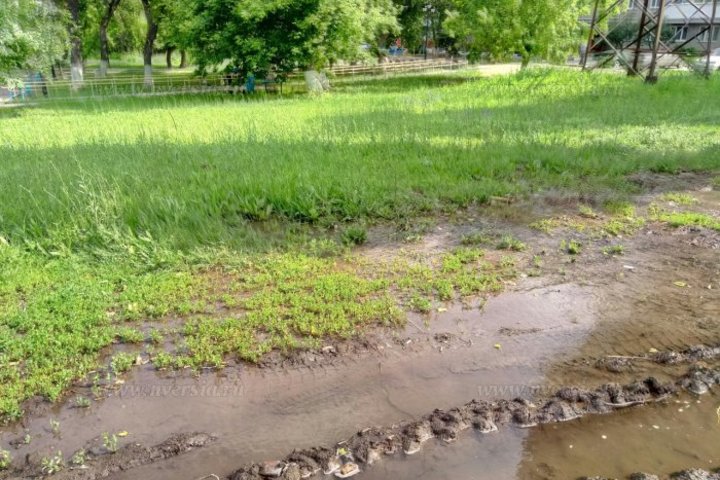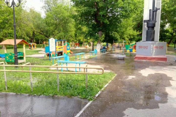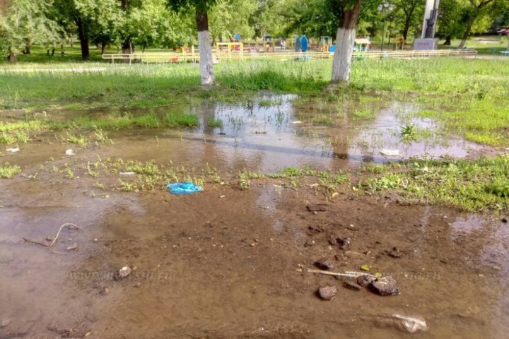 На кадрах видно, что поток затопил проезжую часть на Новоастраханском шоссе, а также пешеходную зону, сквер и игровую площадку на далеко от ТЦ. Дети вынуждены играть посреди огромной лужи, а автомобилисты резко снижать скорость, заметив лужу.