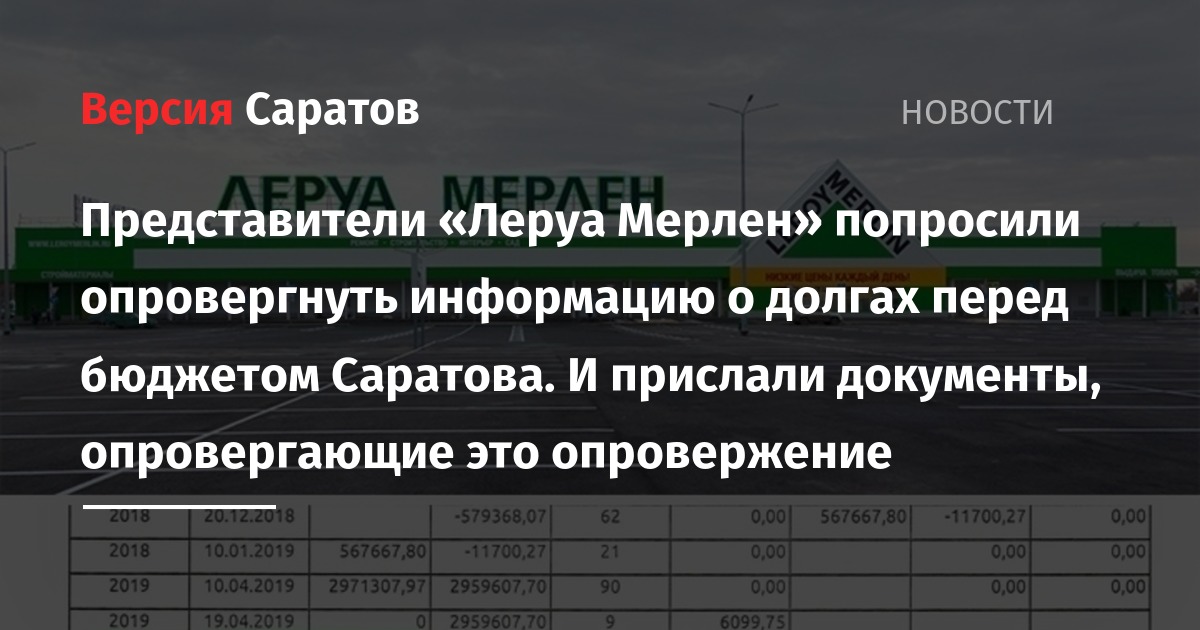 Письмо с темой: «Документы об отсутствии задолженности» было направлено в адрес редакции с электронного почтового ящика представителя пресс-службы «Леруа Мерлен» Виктории Терещенко. Приводим его целиком (орфография и пунктуация сохранены): «Недавно на вашем сайте мы обнаружили статью про задолженность по аренде муниципальной стоянке (далее идет ссылка на материал, — прим. ред.). Во вложении документы, которые предоставили сотрудники Леруа Мерлен Саратов. Прошу поставить на сайт опровержение информации, которая была опубликована в статье. Спасибо».