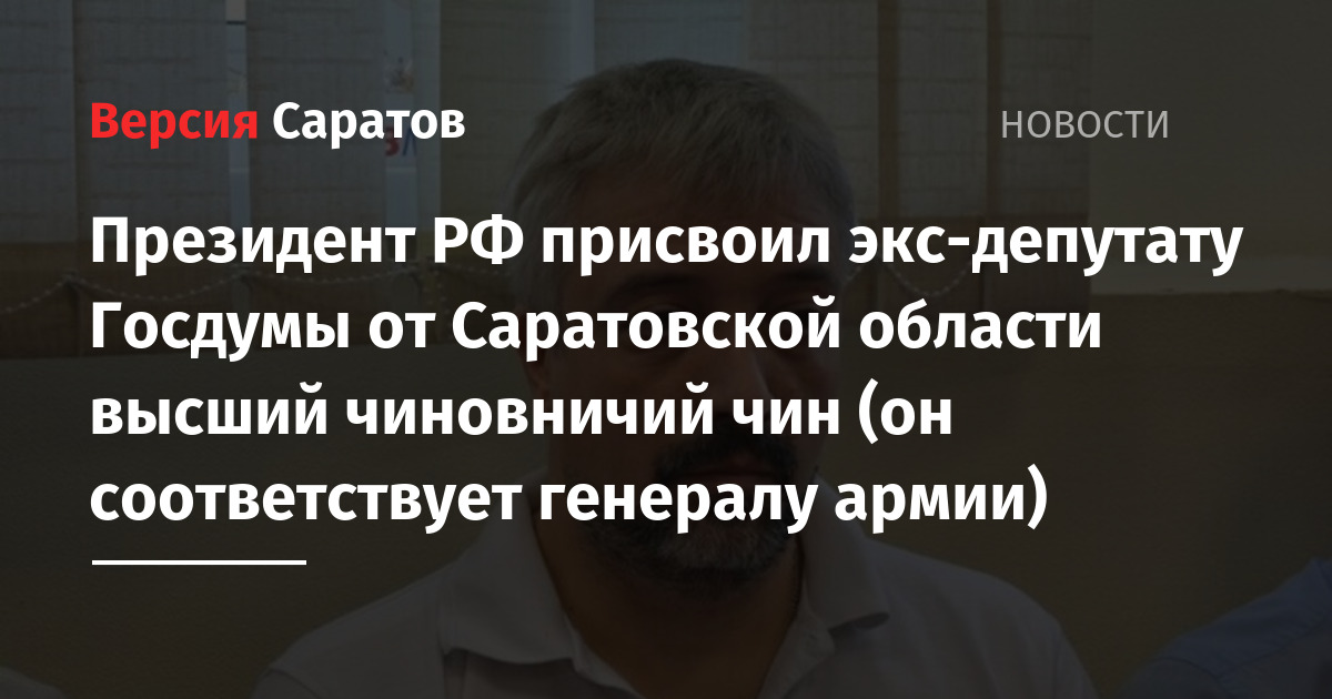 Президент РФ присвоил экс-депутату Госдумы от Саратовской области высший чиновничий чин (он соответствует генералу армии)
