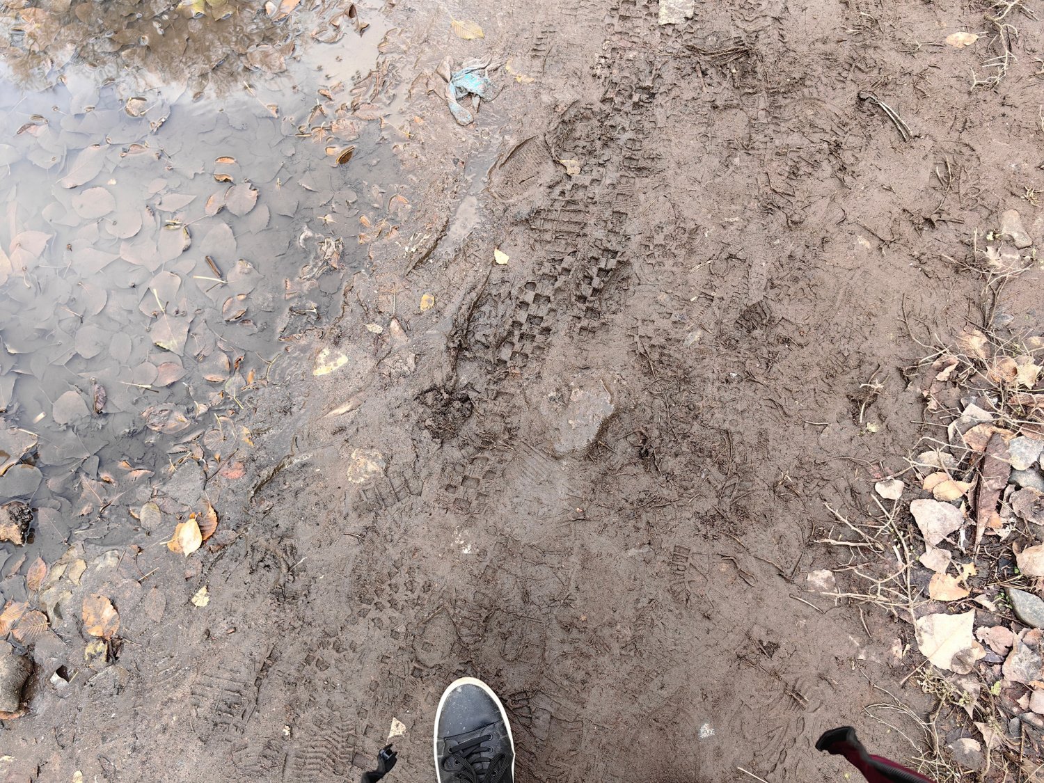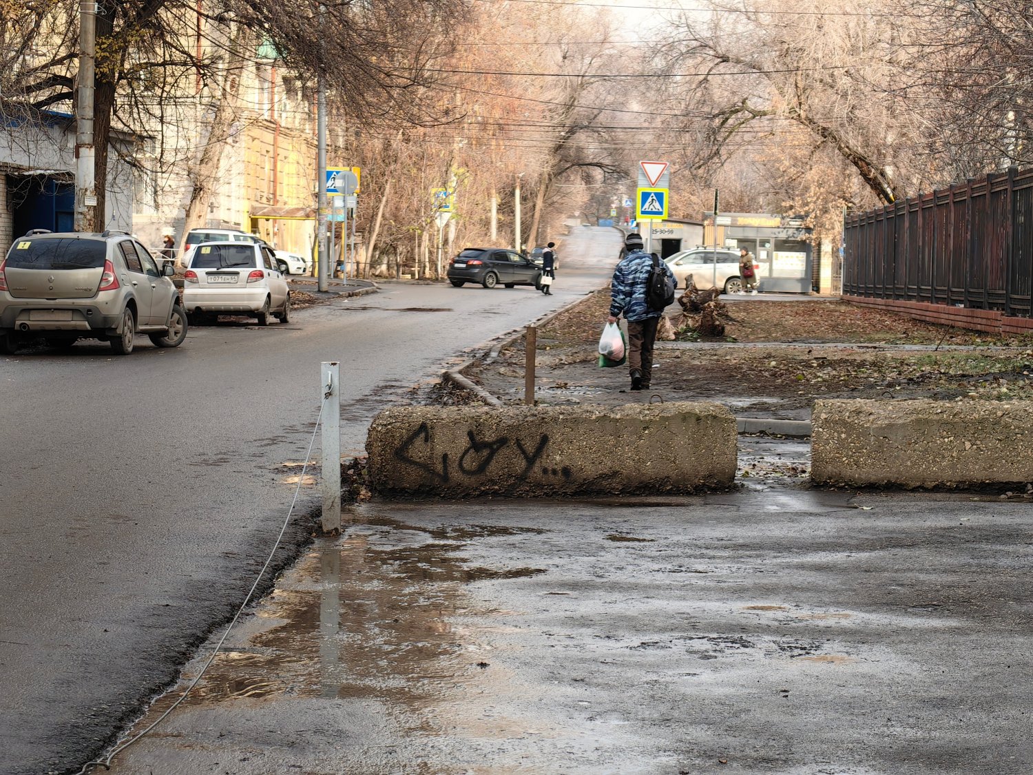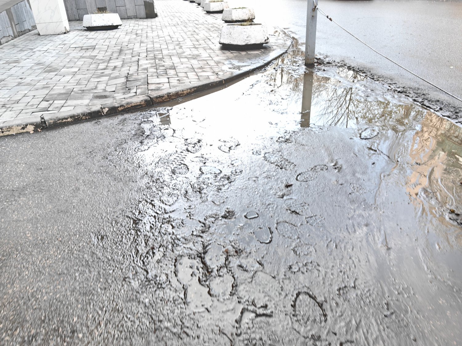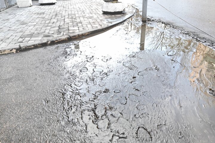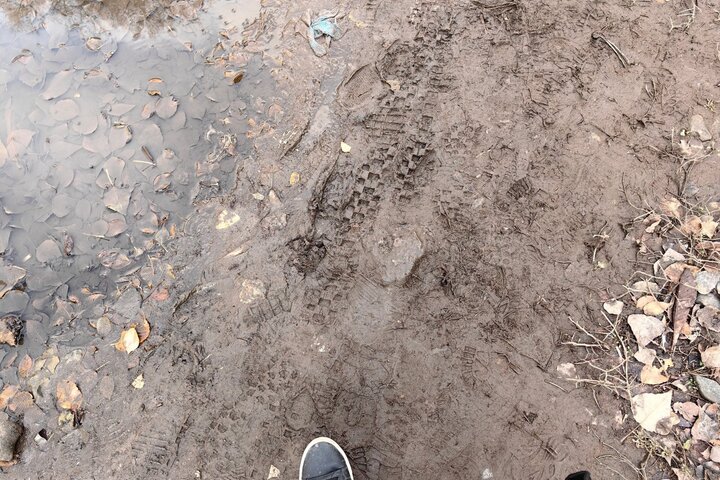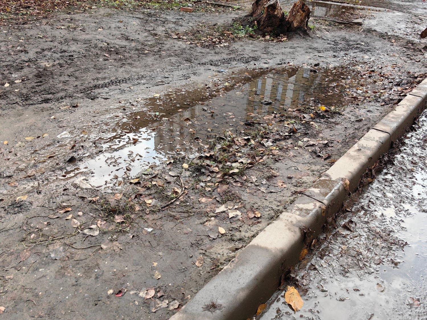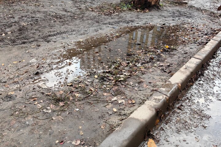 На фото, представленных горожанином, видно, что асфальтовое покрытие там, где должен быть тротуар, отсутствует, и люди идут по грязи.