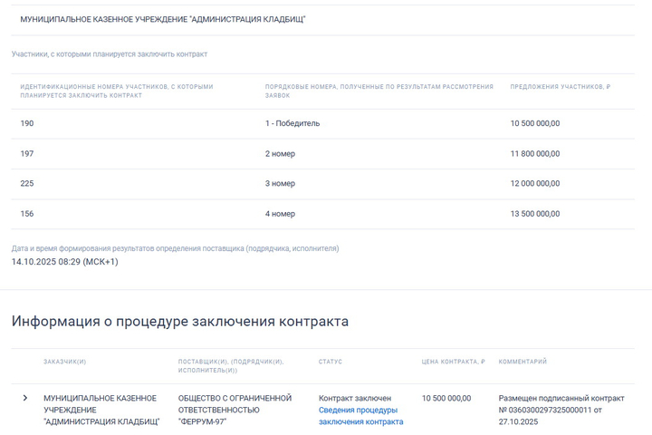 Заказчик работ выступает МКУ Администрация кладбищ». Администрация Саратова оценила проектные работы в 14 млн рублей, но в ходе торгов поступили четыре предложения от участков, которые снизили цену. В итоге победителем выбрали того, кто подвинулся на 25% и согласился выполнить работы за 10,5 млн рублей.