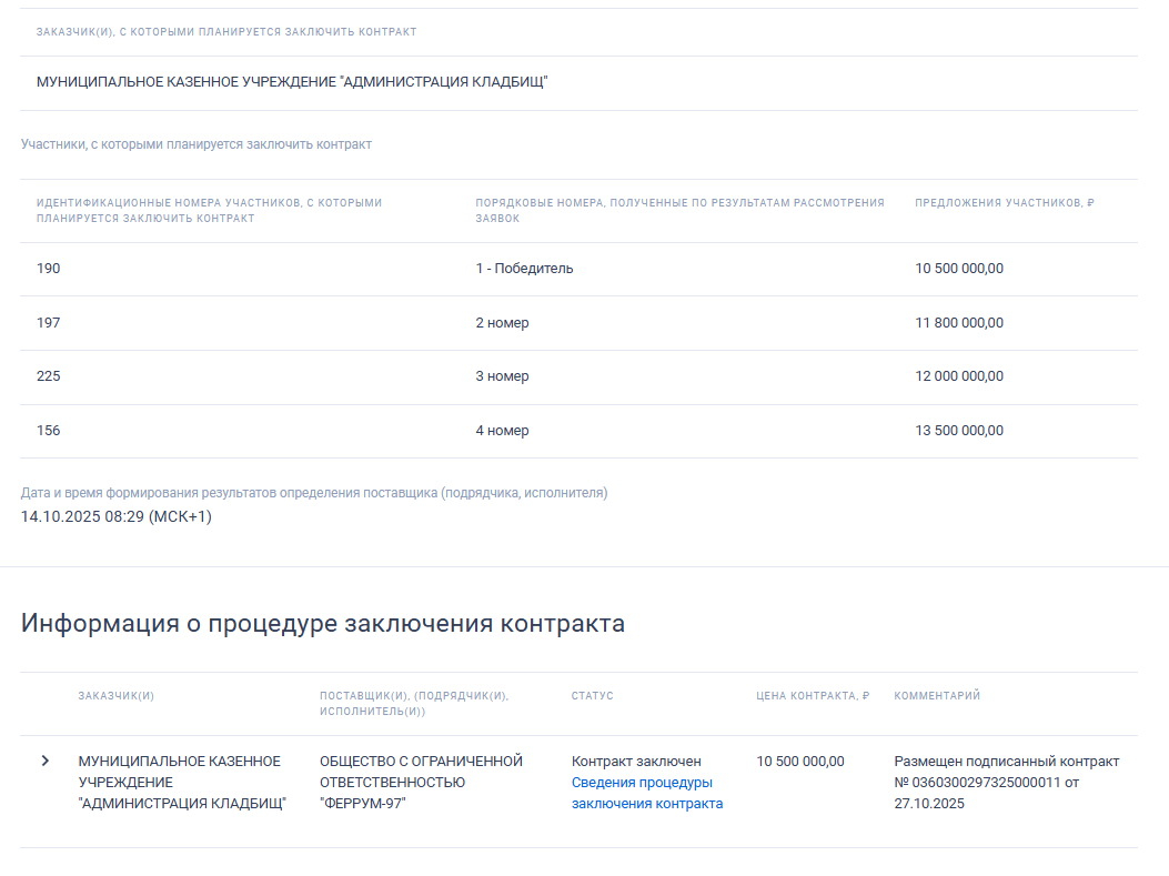 Заказчик работ выступает МКУ Администрация кладбищ». Администрация Саратова оценила проектные работы в 14 млн рублей, но в ходе торгов поступили четыре предложения от участков, которые снизили цену. В итоге победителем выбрали того, кто подвинулся на 25% и согласился выполнить работы за 10,5 млн рублей.