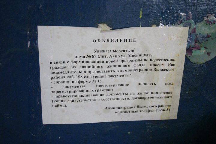 «Администрация Волжского района повесила у нас в доме объявление, чтобы в течение месяца мы предоставили документы о составе семьи и о том, у кого квартира по соцнайму или приватизированная. Все это мы сдали еще в январе 2018 года. Никаких действий со стороны чиновников с тех пор не было. Под программу переселения наш дом не попадает, но находиться в нем страшно. Здесь живут маленькие дети и ходить тут опасно, потому что потолок сыплется, с него валятся куски. В туалет вообще заходить ужасно», — поделилась женщина.