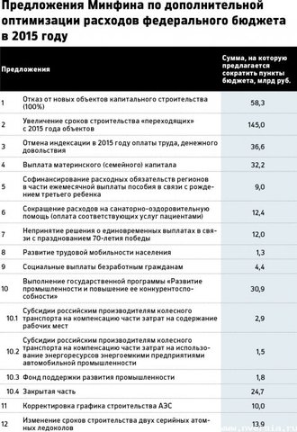 Министерство финансов РФ подготовило предложения по секвестру бюджета на 2015 год. Разработанные Минфином меры должны позволить сократить расходы бюджета на 1,3 трлн рублей, хотя ранее министр Антон Силуанов заявлял о цифре в 1,5 трлн рублей. Секвестр коснется и расходов на обеспечение "майских указов" президента, но основная экономия, как указывают источники РБК в правительстве, будет достигнута за счет переноса половины всех расходов на строительство объектов, финансируемых по госпрограммам, на более поздние сроки и заморозки всех новых строек. Не уточняется, коснутся ли эта заморозка инфраструктуры в Крыму. Также Минфин предлагает отказаться от увеличения числа контрактников, которое, согласно планам, должно было расти не менее чем на 50 тыс. человек ежегодно.