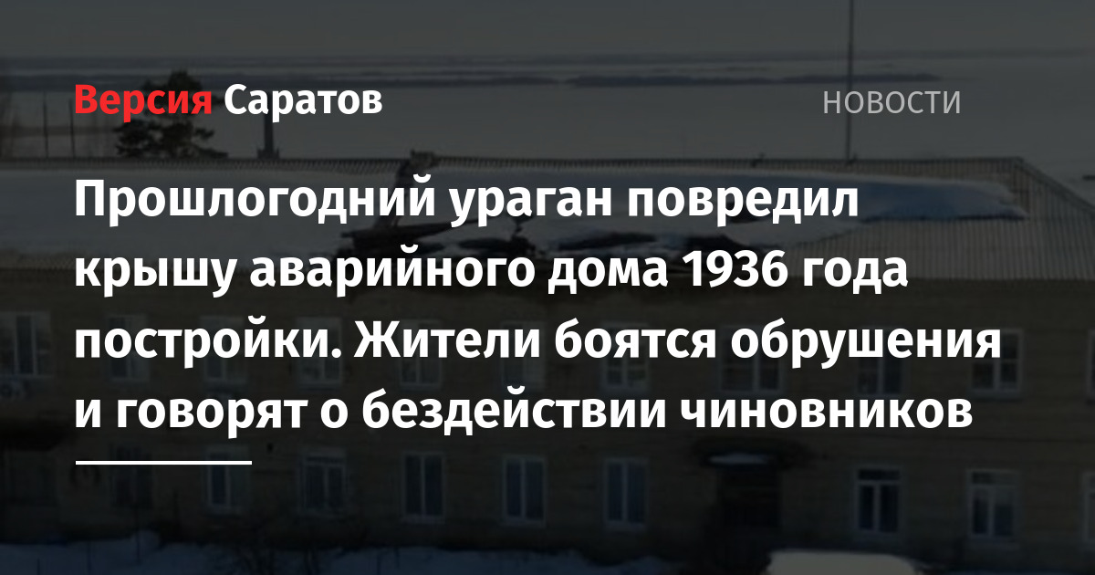 В доме в посёлке Красный Текстильщик в Саратове после урагана, прошедшего ещё в декабре прошлого года, оказалась повреждена крыша. Об этом в Telegram-чате мэрии рассказала пользователь под именем Светлана.