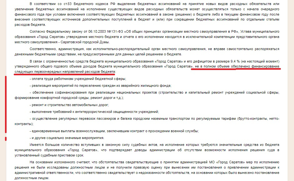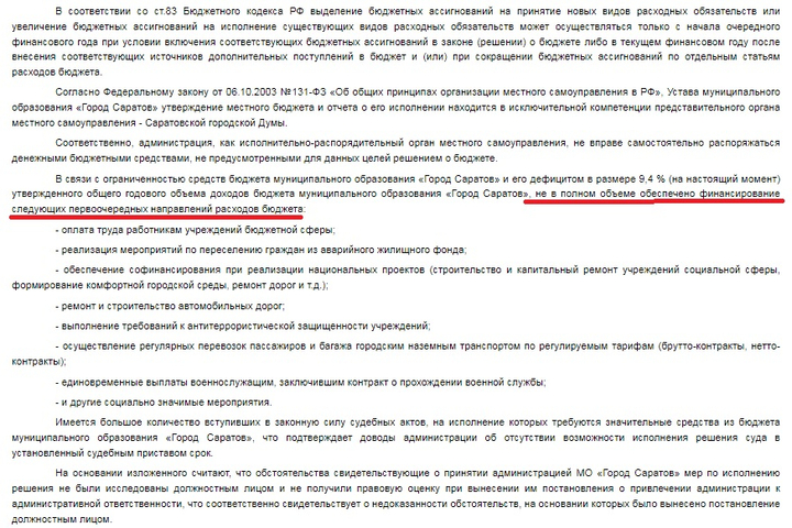Имеется большое количество вступивших в законную силу судебных актов, на исполнение которых требуются значительные средства из бюджета муниципального образования «Город Саратов», что подтверждает доводы администрации об отсутствии возможности исполнения решения суда в установленный судебным приставом срок» (конец цитаты).