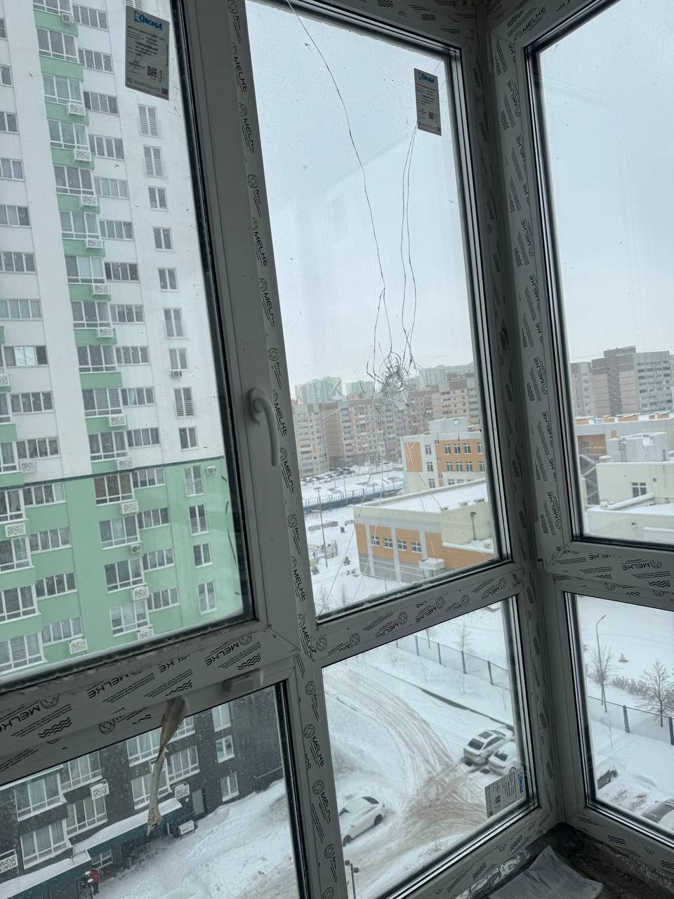 «Пока что мы в квартире не живём. Приехали около 12:00 в субботу, 10 января, проверить ремонт — у нас там один человек работает. Зашли, походили, и тут муж заметил здоровую дыру в окне на кухне. У нас окно хорошее, три стеклопакета, все пробило.