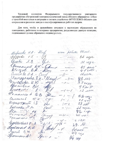 Работники петровского завода "Молот" написали обращение к Президенту РФ Владимиру Путину.