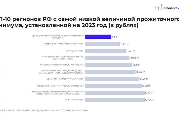 Худшие результаты продемонстрировали ДНР и ЛНР. В этих республиках установлен прожиточный минимум в размере 11213 рублей. Второе место поделили Запорожская и Херсонская области (11644 рубля), а третье заняла Липецкая область (11931 рубль).