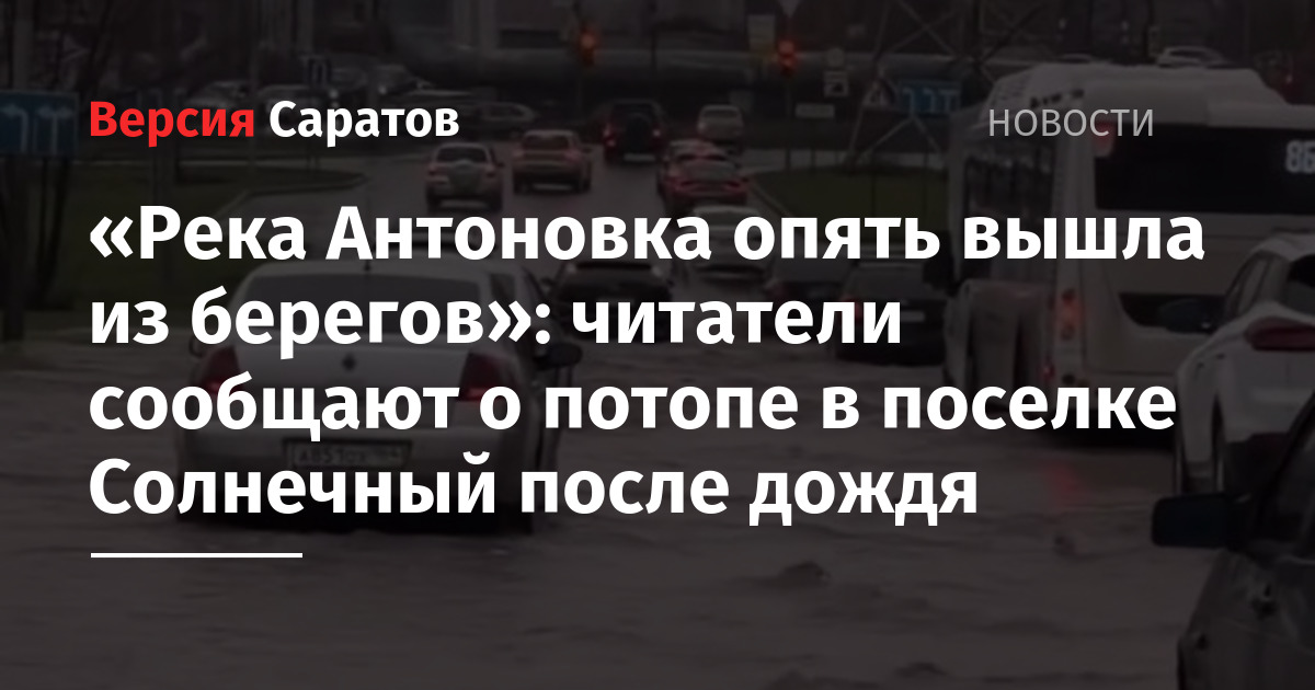 В поселке Солнечный после прошедшего в ливня затопило улицу Антонова. Видео с затопленной улицей было опубликовано в Telegram-канале «Солнечный Саратов». «Река Антоновка опять вышла из берегов», — говорится в подписи к ролику. Автомобилям приходится практически плыть по проезжей части. Образовалась пробка из автомобилей на тротуаре.