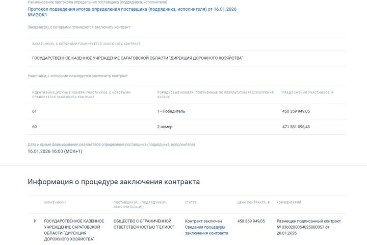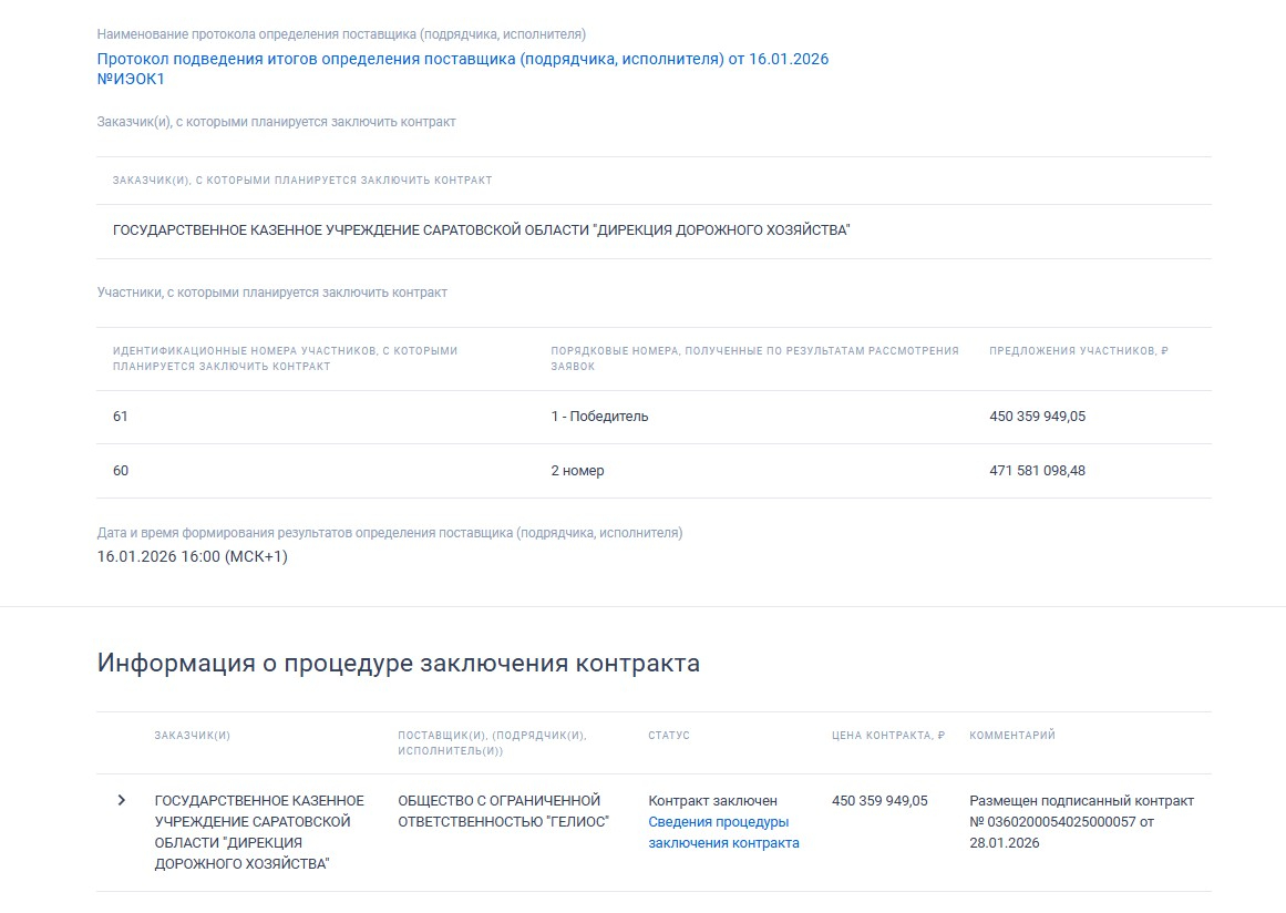 По итогам торгов было подано две заявки. Благодаря снижению цены победу одержало ООО «Гелиос». Это фирма из Пензы, которая несколько лет подряд занималась содержанием 77 километров дорог Саратова, которые находится на балансе региона. Причем в 2024 году пензенского подрядчика критиковали депутаты Саратовской городской думы за слишком долгий текущий ремонт улицы Чернышевского.
