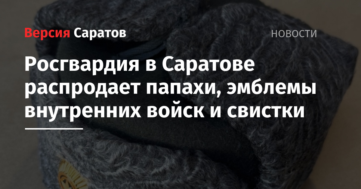 Покупателей ищут для 242 эмблем внутренних войск МВД, 4 тысяч «защитных эмблем», 45 постовых свистков, четырех папах и трех шапок из каракуля, 58 повседневных женских пилоток, 234 шерстяных пилоток цвета морской волны, 956 пар двухпалых зимних перчаток и так далее. Все хранится в Саратове, на Огородной, 200.