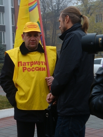 Всего на митинге присутствовала примерно дюжина «патриотов», а примерно через десять минут после начала акции к желтым флагам с радугой присоединился еще один, красный. Впрочем, коммунистку, развернувшую партийный стяг, никто толерантно не прогнал.