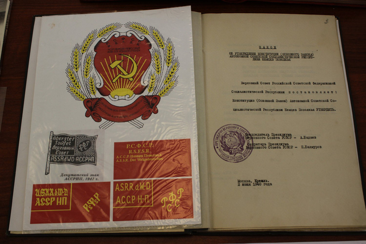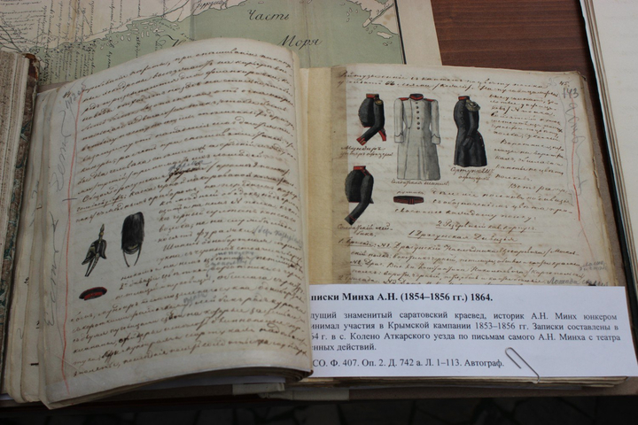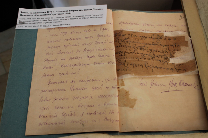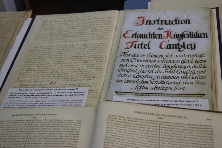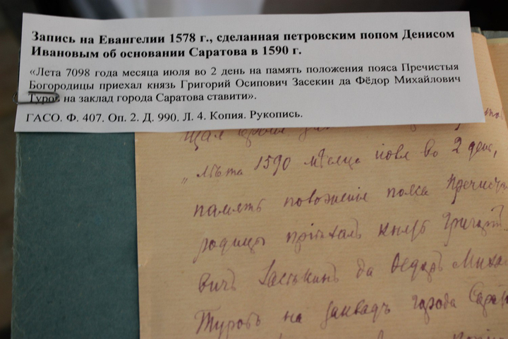 Посетители увидели более сотни документов. Горожанам показали свидетельство об основании Саратова, подписанный императрицей Екатериной II манифест о разрешении иностранцам селиться в Поволжье, конституцию республики немцев Поволжья, дворянскую родословную книгу, фотографию момента закладки бетона в плиту первого реакторного отделения балаковской АЭС.