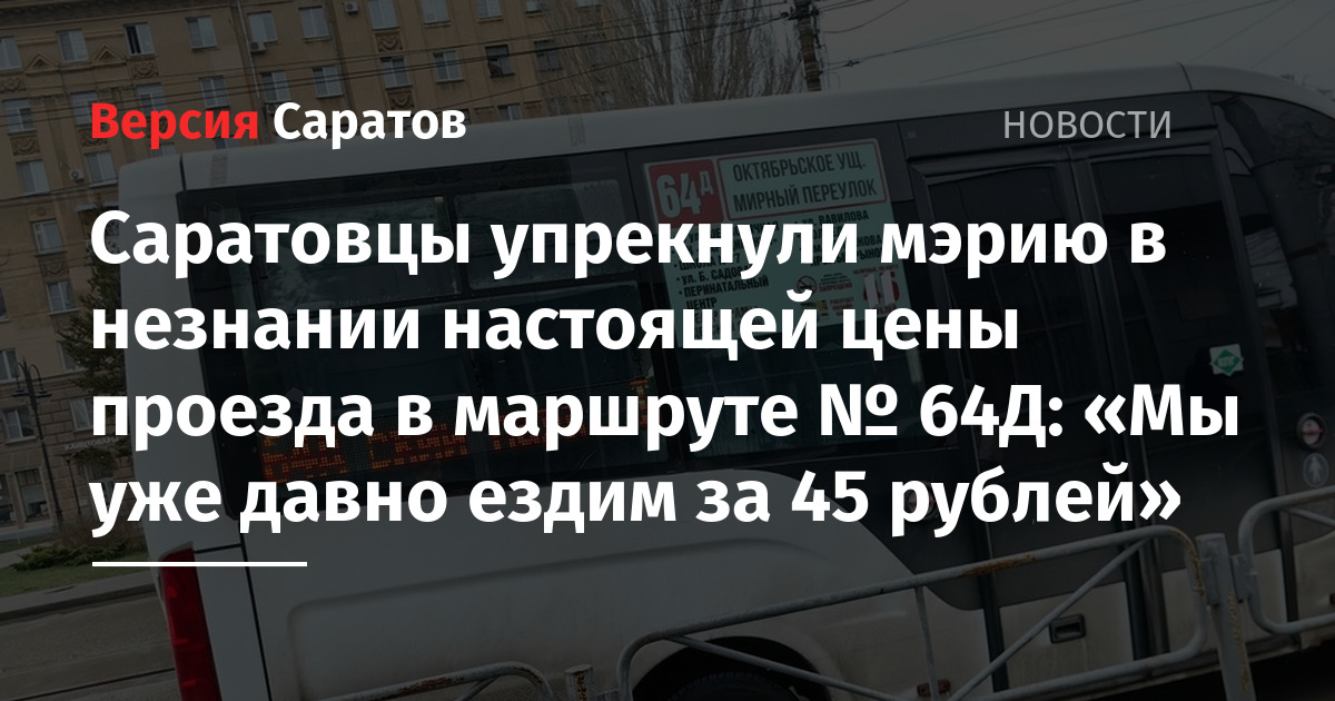 «Прочитали, что ООО „Пассажиртранс“ повысит цену проезда на маршруте № 64Д с 9 апреля с 39 до 48 рублей. Чиновники хоть бы иногда выходили из кабинетов, может тогда бы знали, что на маршрутках 64Д мы уже давно ездим в Октябрьское ущелье от Крытого рынка за 45 рублей. Какие 39? Откуда в администрации взяли эту цифру?» — возмутились саратовцы в обращении в адрес редакции.