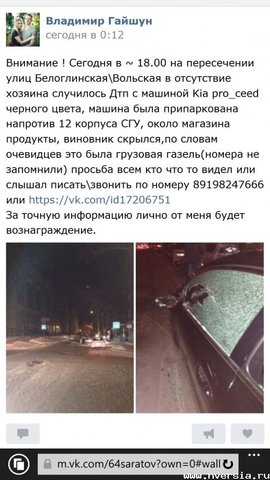 Вчера в 17.30 напротив XII корпуса СГУ им. Чернышевского произошло ДТП с участием грузовой "ГАЗели" и Kia pro_ceed. В социальной сети "ВКонтакте" водитель иномарки Владимир Гайшун попросил откликнуться свидетелей ДТП, которые запомнили номер предполагаемого виновника аварии.
