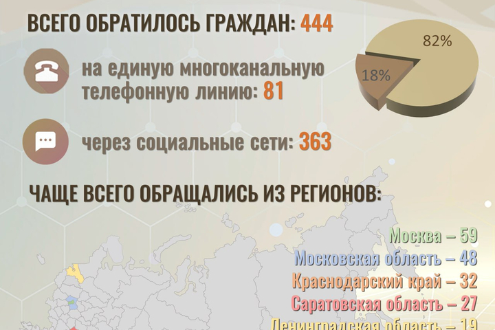 Всего за последние 24 часа в СК РФ поступило 444 обращения от граждан. Больше всего жаловались москвичи (59 обращений), а также жители Подмосковья (48 обращений) и Краснодарского края (32 обращения). Саратовская область заняла третье место. За сутки в федеральное ведомство обратились 27 жителей региона. Замыкает топ-5 Ленинградская область (19 обращений).