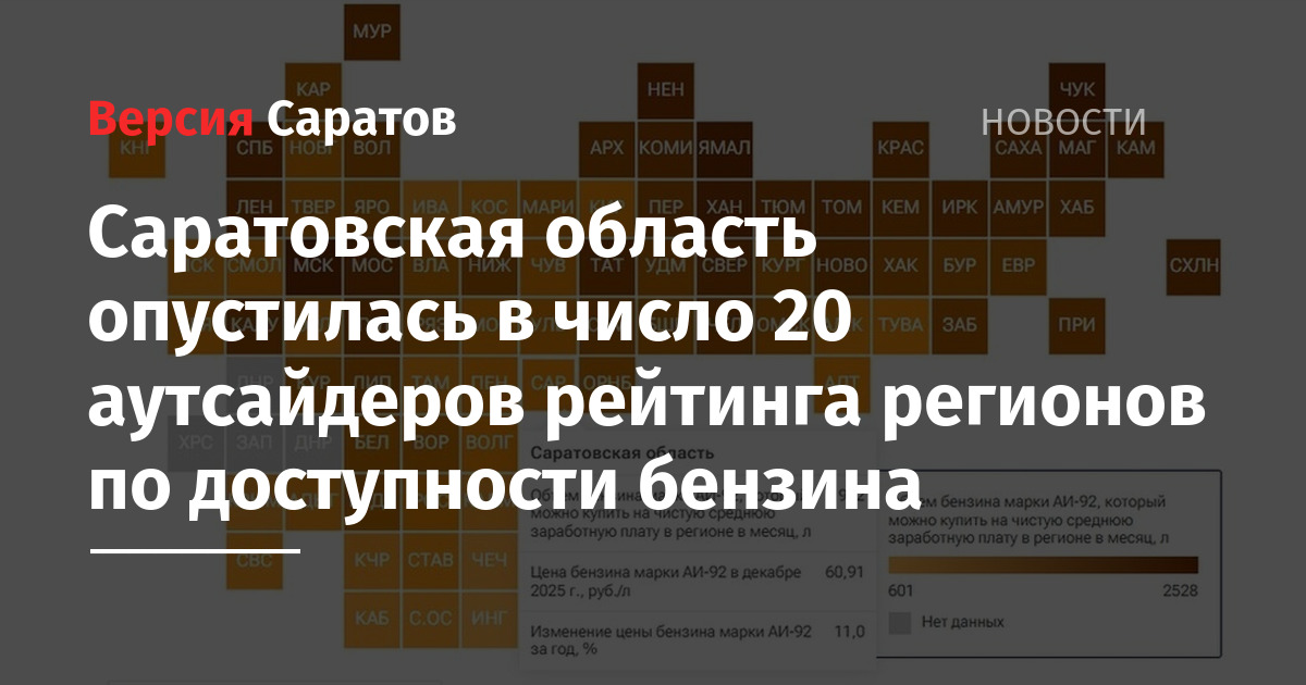Саратовская область по итогам 2025 года оказалась в числе 20 аутсайдеров рейтинга российских регионов по доступности бензина. Результаты ежегодного исследования опубликовало сегодня, 2 февраля, РИА Новости.