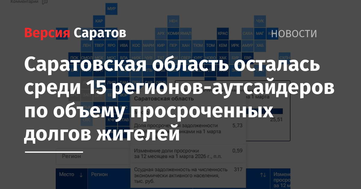 В Саратовской области за прошедший год вырос объем просроченных долгов жителей перед банками, однако регион на одну строчку поднялся в рейтинге по просроченной задолженности населения. Итоговый рейтинг, данные которого рассчитывались на 1 марта 2026 года, опубликовало РИА Новости.