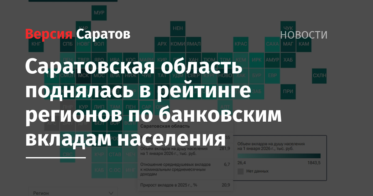 Саратовская область за год смогла немного улучшить позиции в рейтинге российских регионов по вкладам населения. Если по итогам 2024 года регион занимал 57-е место в списке, то по итогам 2025 года поднялся на 55-е место, следует из исследования, итоги которого обнародовало сегодня РИА Новости.