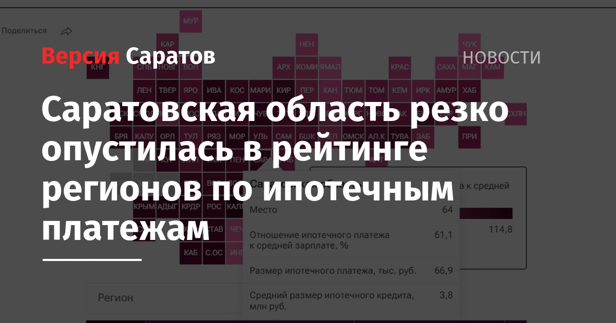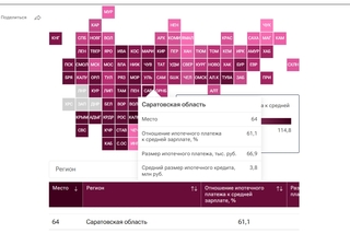 Саратовская область резко опустилась в рейтинге российских регионов по ипотечным платежам. По результатам ежегодного исследования, которое проводят эксперты РИА Новости, регион опустился с 56-го на 64-е место.