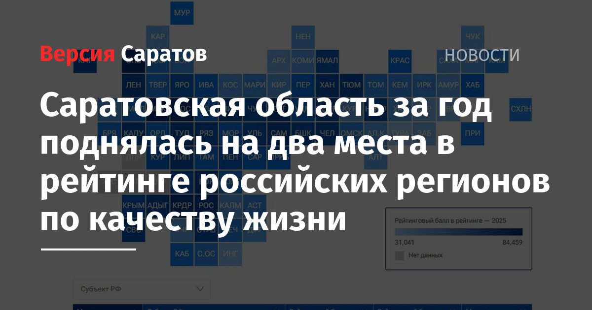 Саратовской области удалось за год немного улучшить позиции в рейтинге российских регионов по качеству жизни. По итогам 2025 года регион поднялся с 38-го на 36-е место, а рейтинговый балл улучшился с 55,762 до 57,916 (из 100 возможных). Итоговый рейтинг опубликовало сегодня РИА Новости.