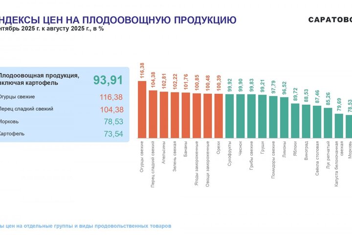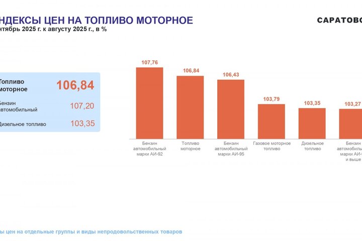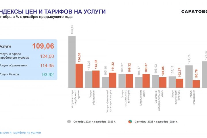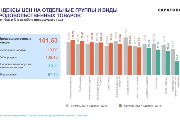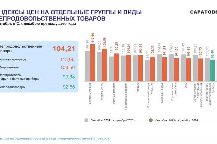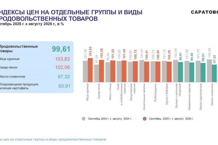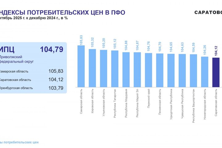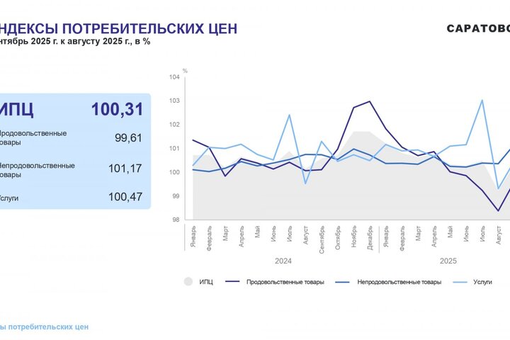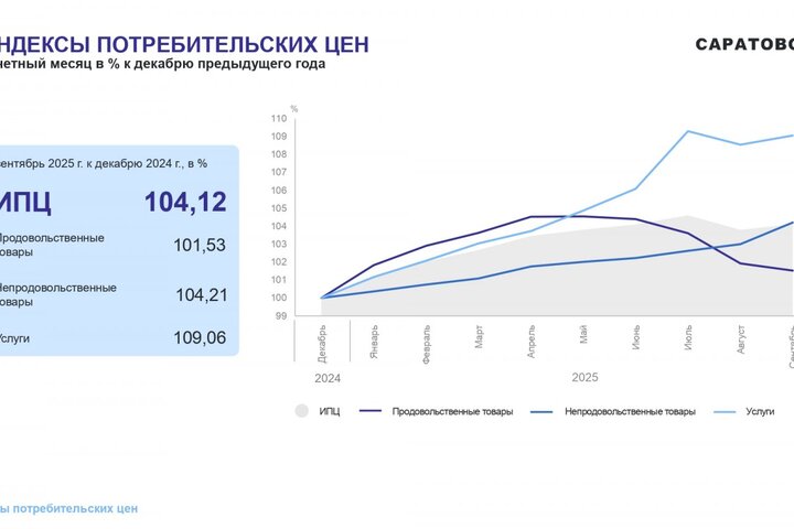 Саратовская область по итогам девяти месяцев 2025 года заняла предпоследнее место в ПФО по индексу потребительских цен. По подсчетам Саратовстата, с декабря 2024 года цены в регионе в среднем выросли на 4,12%.