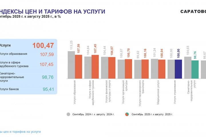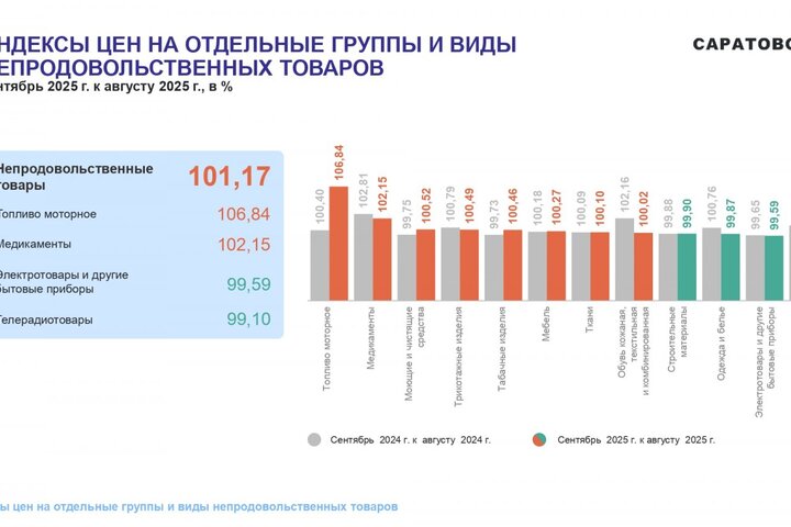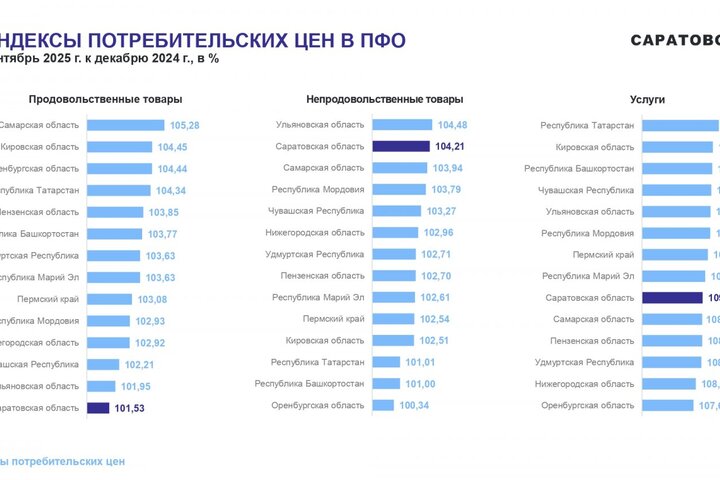 По продовольственной инфляции Саратовская область оказалась на последнем месте в ПФО. Продукты, по данным статистики, подорожали в среднем всего 1,53%. На первом месте Самарская область (5,28%). По росту цен на непродовольственные товары Саратовская область на втором месте к округе, еще больше цены выросли только в Ульяновской области — на 4,48%, в Оренбургской области — всего 0,34%. По росту цен на услуги с результатом 9,06% регион на 9 месте. Наибольший рост наблюдается в Татарстане (11,48%), самый низкий — в Оренбуржье — 7,69%.