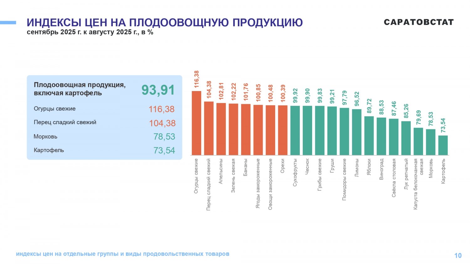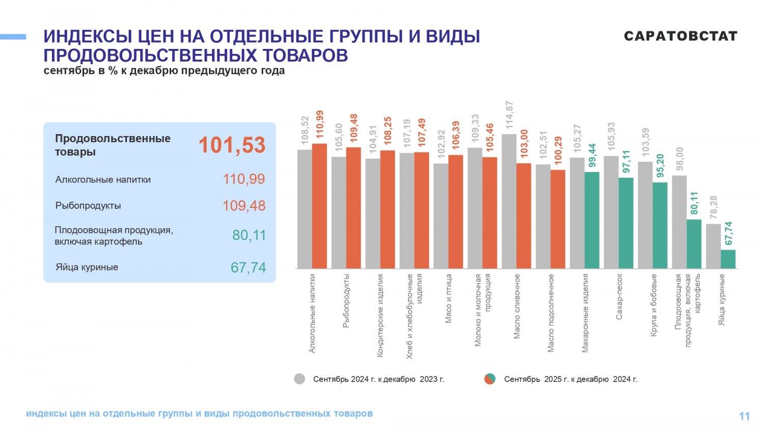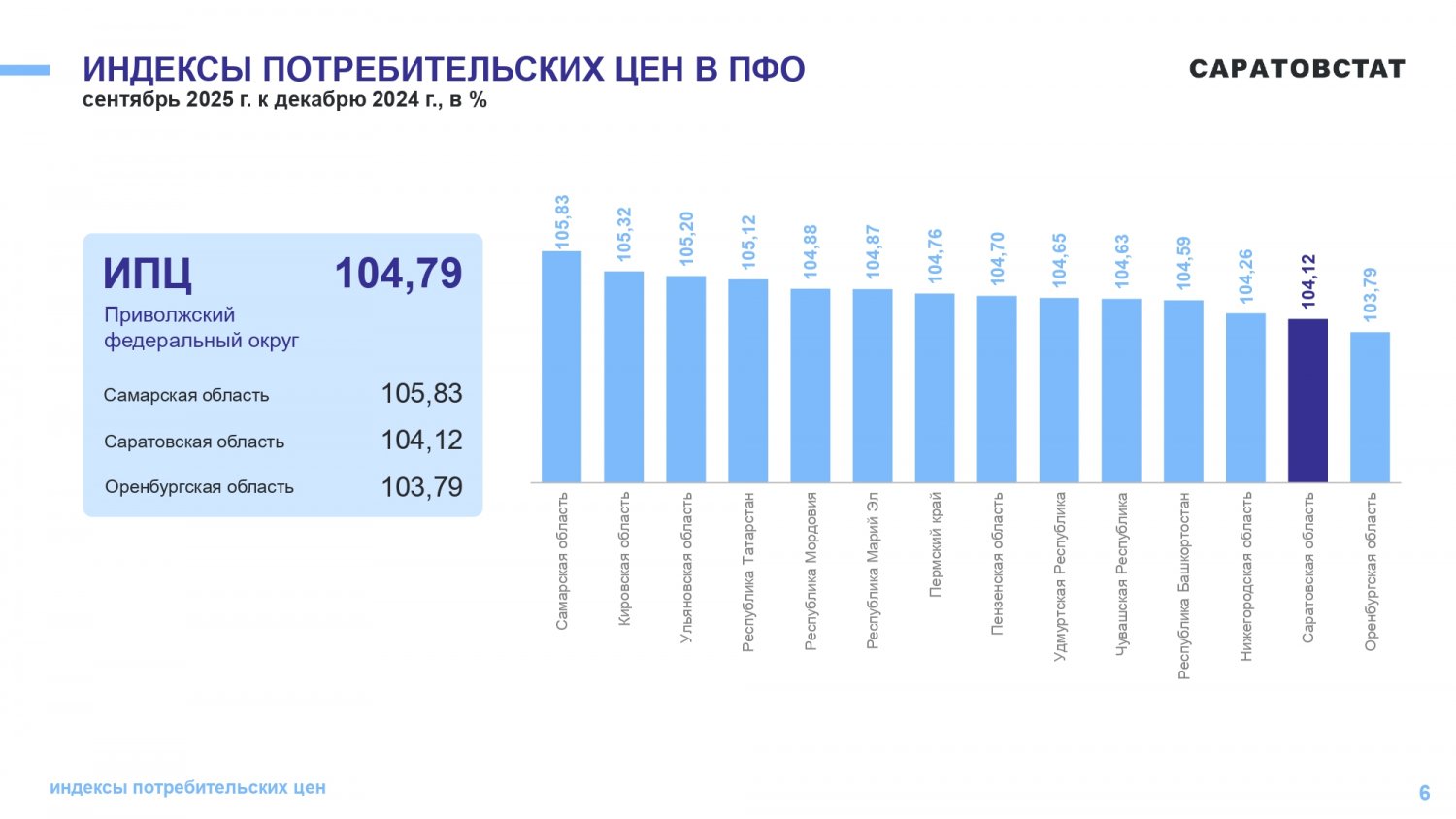 Саратовская область по итогам девяти месяцев 2025 года заняла предпоследнее место в ПФО по индексу потребительских цен. По подсчетам Саратовстата, с декабря 2024 года цены в регионе в среднем выросли на 4,12%.