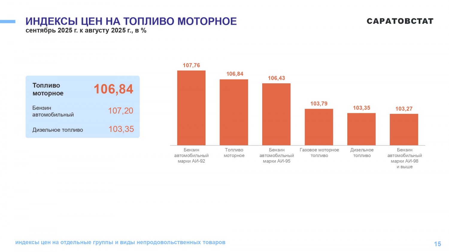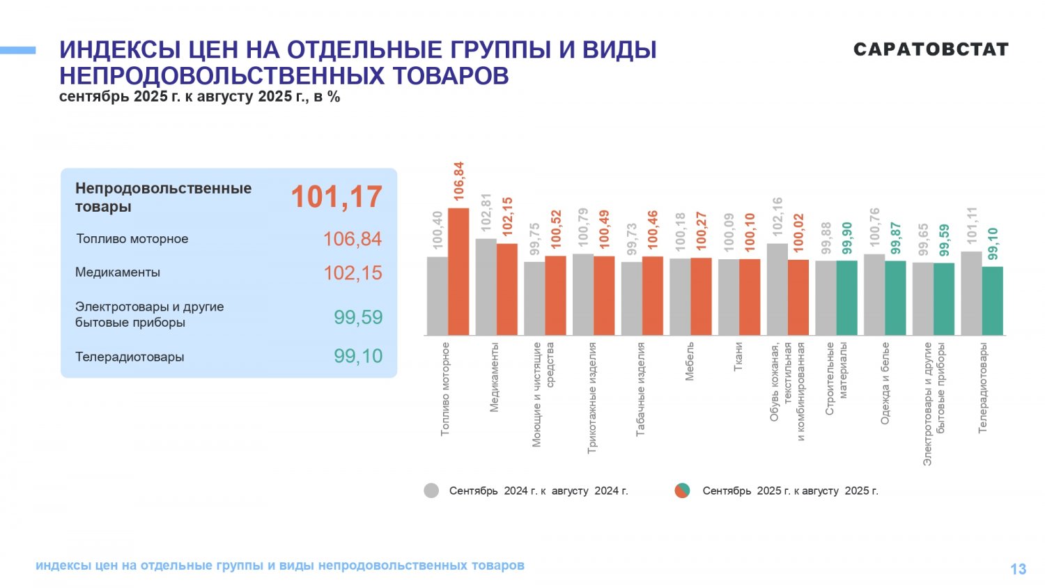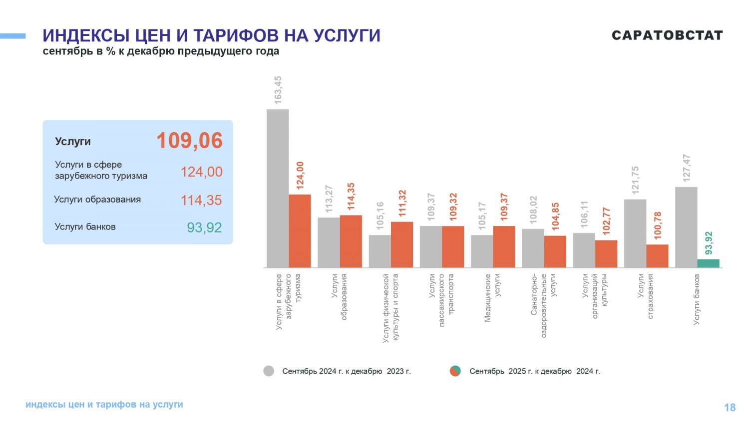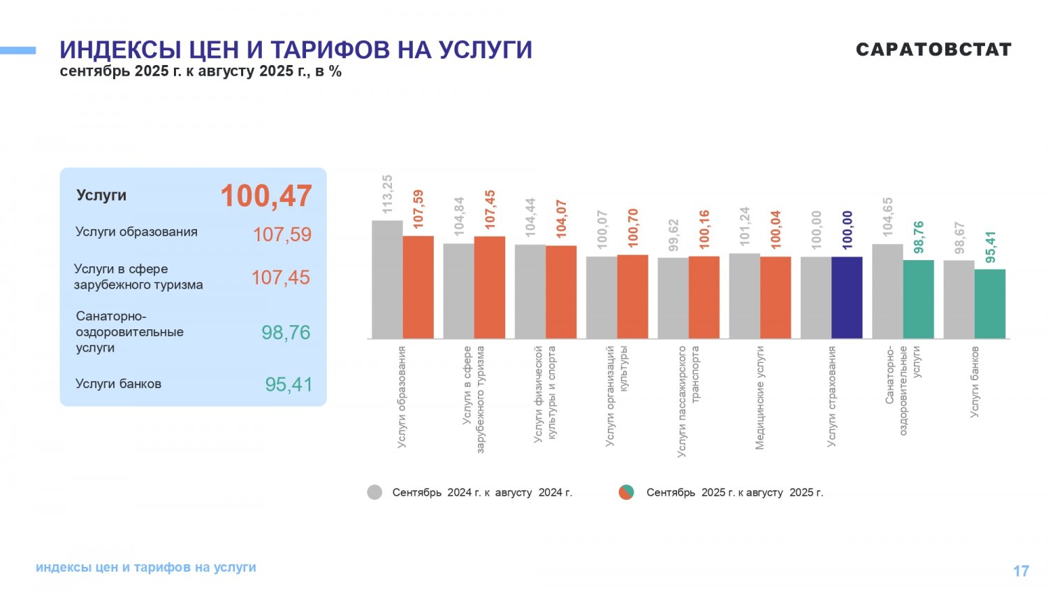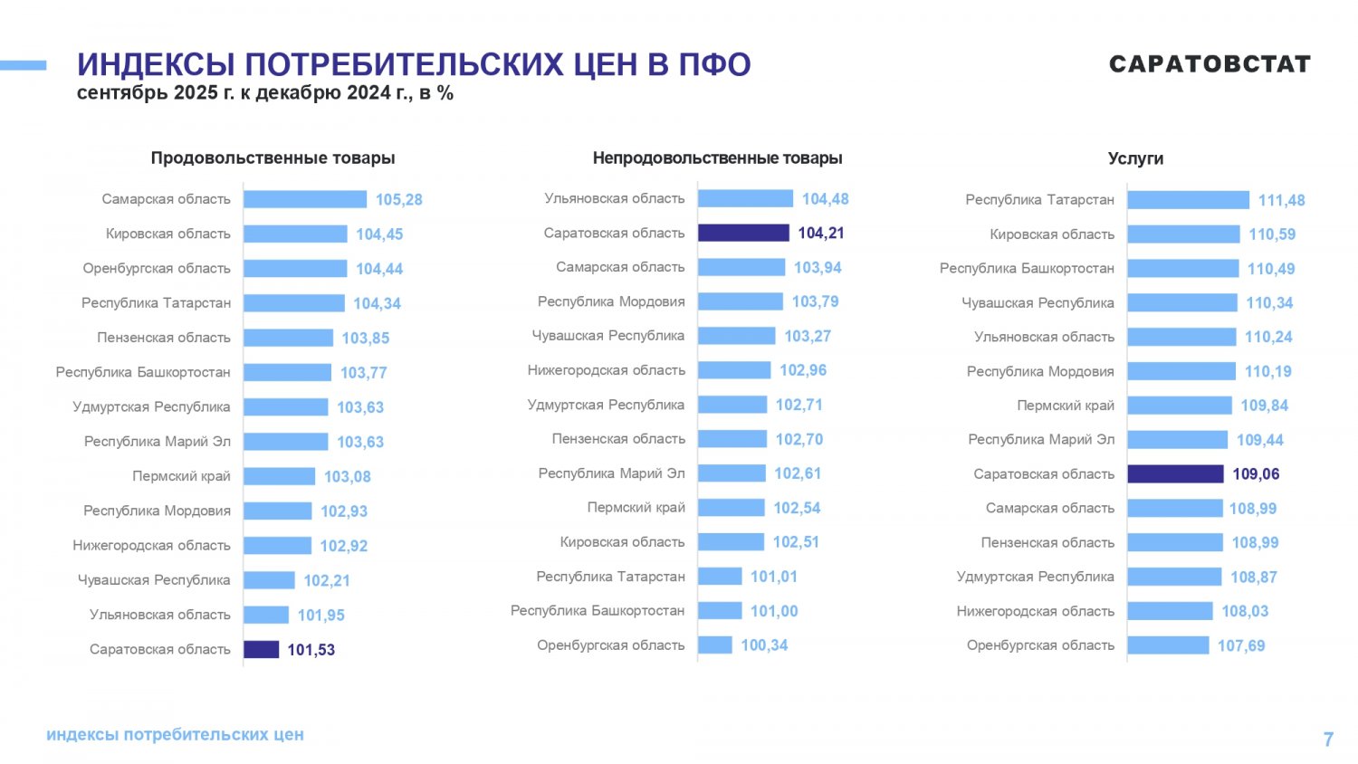 По продовольственной инфляции Саратовская область оказалась на последнем месте в ПФО. Продукты, по данным статистики, подорожали в среднем всего 1,53%. На первом месте Самарская область (5,28%). По росту цен на непродовольственные товары Саратовская область на втором месте к округе, еще больше цены выросли только в Ульяновской области — на 4,48%, в Оренбургской области — всего 0,34%. По росту цен на услуги с результатом 9,06% регион на 9 месте. Наибольший рост наблюдается в Татарстане (11,48%), самый низкий — в Оренбуржье — 7,69%.