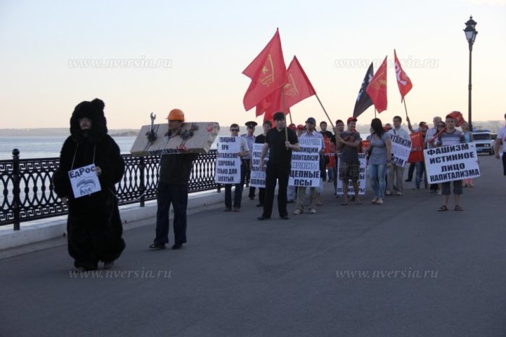 Представители региональных отделений пытались театрализовано показать свое видение обстановки в стране. Во главе колонны шел "рабочий", скованный кандалами капитализма, а на цепи его вел "медведь", олицетворяющий единоросса. За ним шли остальные активисты, скандируя: "Вернуть народу права и свободу!", "Вернуть народу шахты и заводы!", "Буржуев на нары, рабочих - на Канары!", "Школа - не рынок, знания - не товар!", "Меньше храмов, больше школ!", "Нет - фашизму! Нет - капитализму!"