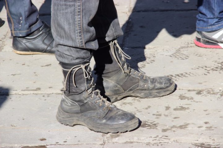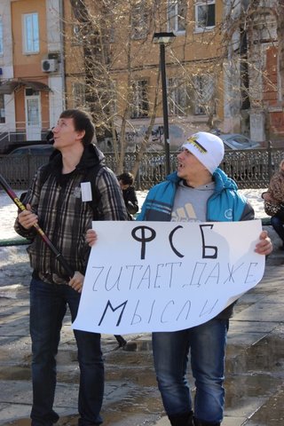 Около десятка участников акции расположились возле памятника первой учительнице с плакатами: "ЦПЭ, может, хватит ловить школьников и пенсионеров?" и "ФСБ читает даже мысли". Также они растянули самодельный баннер с надписью "Русское мнение не преступление". Последнюю они объяснили тем, что большинство обвинительных приговоров по указанным выше статьям выносится в отношении русских людей.
