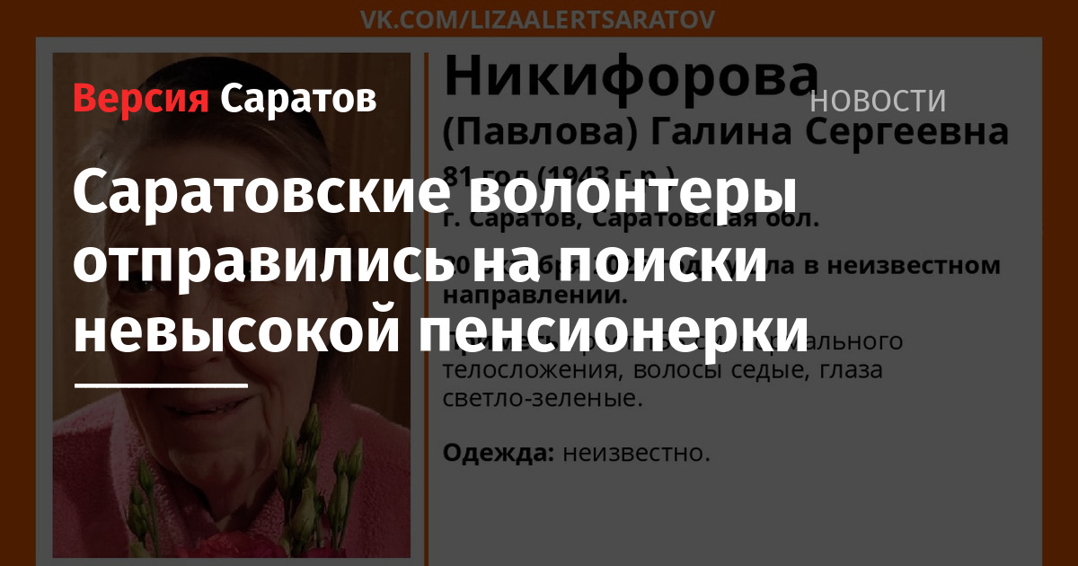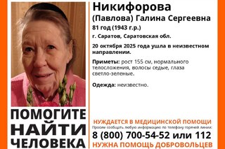Сегодня, 20 октября, в Саратове пропала 81-летняя Галина Никифорова (Павлова). Волонтеры отправились на ее поиски. Об этом сообщили в группе «Поисковый отряд „ЛизаАлерт“ Саратовской области» в соцсети «ВКонтакте».
