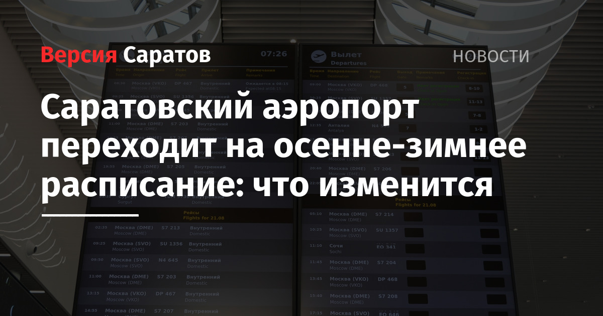 В воскресенье, 26 октября, саратовский аэропорт «Гагарин» переходит на осенне-зимнее расписание полетов. Оно будет действовать до 28 марта 2026 года. В пресс-службе аэропорта уточнили, что в расписании останутся 12 направлений, рейсы по которым будут выполнить 9 авиакомпаний.