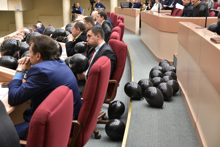 Во время его выступления депутаты от КПРФ провели публичную акцию: надули черные воздушные шарики и расположили их перед собой на столах. Работники думы, в частности замруководителя аппарата парламента Максим Федукин, попытались забрать шары, но встретили серьезное сопротивление. Александр Анидалов (КПРФ) даже попросил вызвать полицию, поскольку, по его словам, работники думы пытаются отобрать имущество депутатов. Председатель думы Иван Кузьмин пообещал, что вызовет правоохранителей.