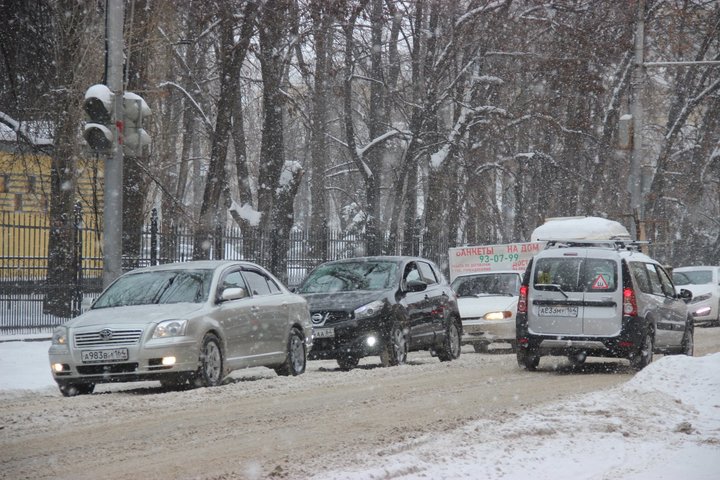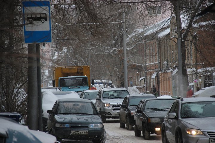 Сегодня Саратов и другие города области накрыл снегопад. В утренний час-пик на дорогах образовались десятибалльные пробки.