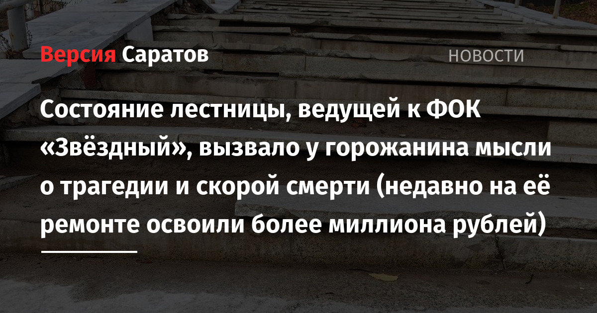 После этого на объекте провели ремонтные работы. Согласно опубликованному акту приемки выполненных работ, к 1 октября 2025 года подрядчик исполнил обязательства в полном объеме. На основании этого акта ему была выплачена вся сумма контракта: более миллиона рублей. Однако в итоге оказалось, что лестница отремонтирована только на половину. Как пояснил представитель фирмы-исполнителя, с которым удалось пообщаться нашему корреспонденту, у города хватило денег только на поллестницы. В ноябре 2025 года состояние ступеней вновь вызвало резкую критику. В нашу редакцию обратился саратовец, шокированный тем, что лестница разбита и опасна для горожан.