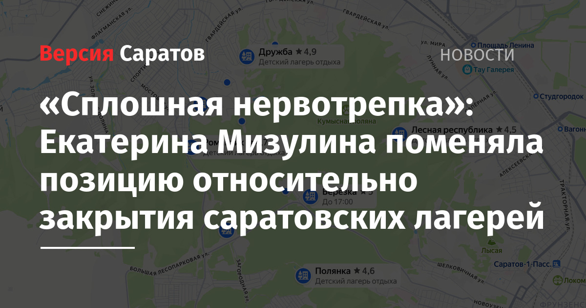 На прошлой неделе — 15 апреля — мэр Саратова Игорь Молчанов заявил, что в этом году будет ограничена работа летних детских лагерей в черте Кумысной поляны и обосновал это «исключением рисков», связанных с «объективной угрозой безопасности». Ситуация вызвала очень бурную реакцию. В том числе, глава «Лиги безопасного интернета» Екатерина Мизулина пообещала обратиться по этому поводу к спикеру Госдумы Вячеславу Володину.