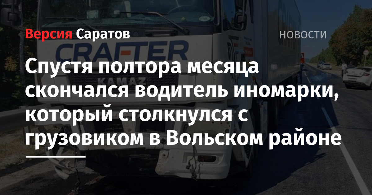 Скончался участник ДТП, которое произошло в июле в Вольском районе. Об этом ИА «Версия-Саратов» рассказали в региональном минздраве.