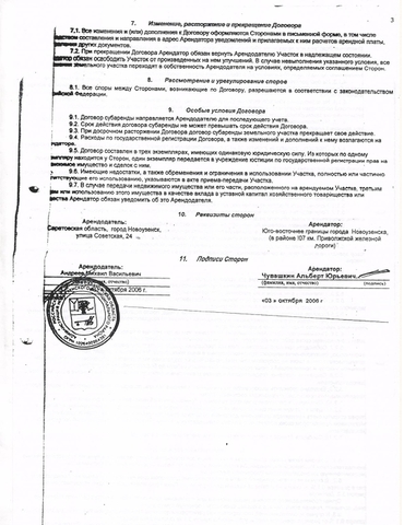 Согласно этому документу, договор заключен сроком на пять лет с 3 октября 2006 года по 3 октября 2011 года. Площадь этого участка составляет 2 гектара, а годовой размер арендной платы - 1197 рублей 28 копеек.