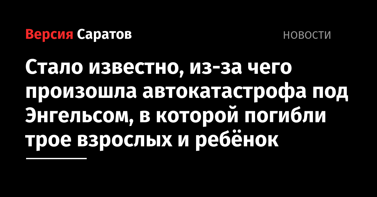 Напомним, авария произошла вчера, 28 декабря, в 16:57, на подъезде к Энгельсу от федеральной трассе Р-229 Самара-Пугачев-Энгельс-Волгоград. Вблизи посёлка Прибрежный столкнулись ВАЗ-2106 и большегруз. Министр здравоохранения Олег Костин уточнил, что на месте скончались 40-летний водитель ВАЗа, две женщины-пассажирки и 6-летний ребёнок. Пассажир легковушки находился в крайне тяжёлом состоянии.